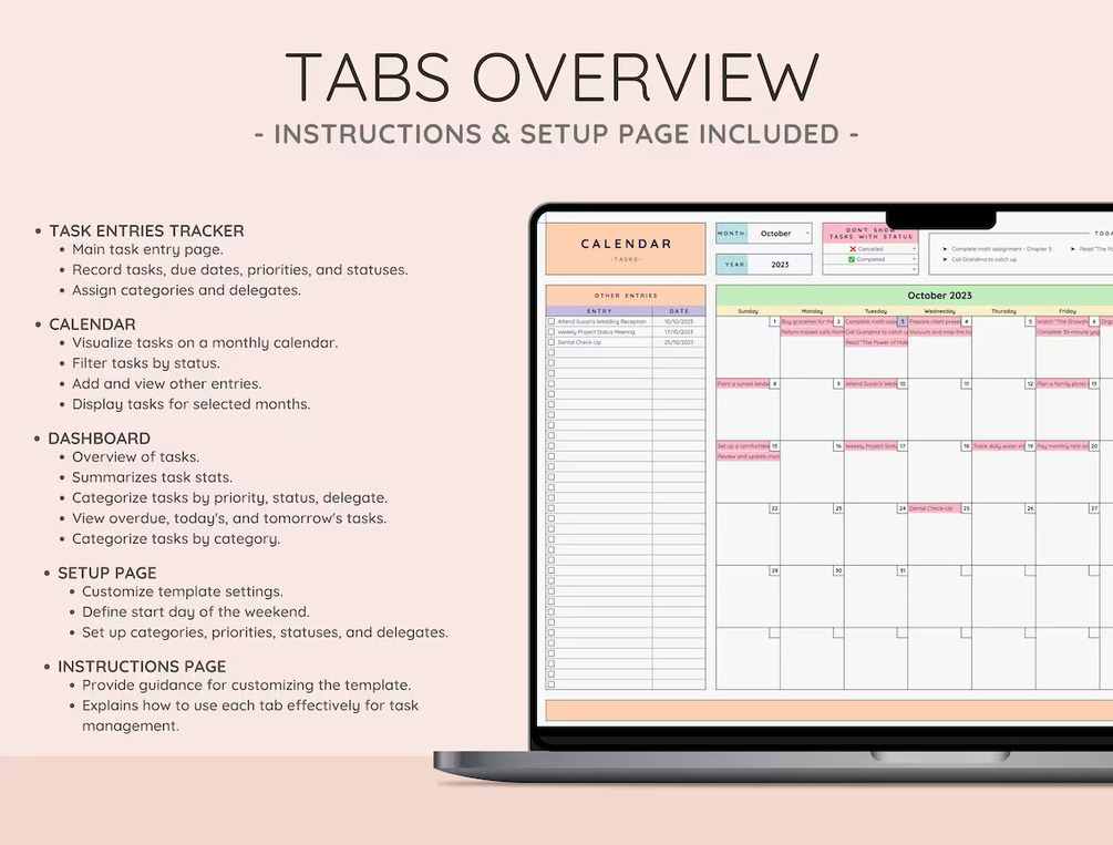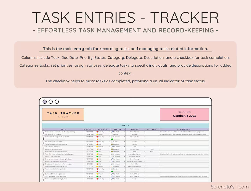 β€ Task Entries-Tracker: Log tasks, due dates, priorities, statuses, categories, and more.